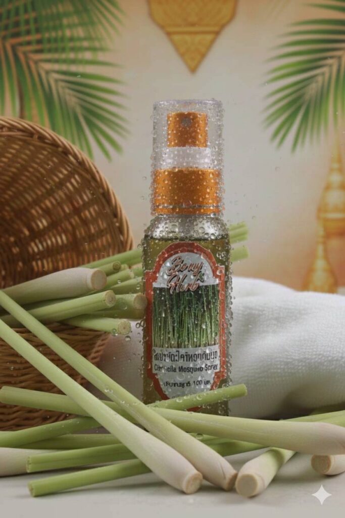 สเปรย์ที่ทำจากตะไคร้หอมสมุนไพรธรรมชาติ มีกลิ่นหอมสดชื่น ช่วยปกป้องจากยุงและแมลงรบกวนได้อย่างอ่อนโยน