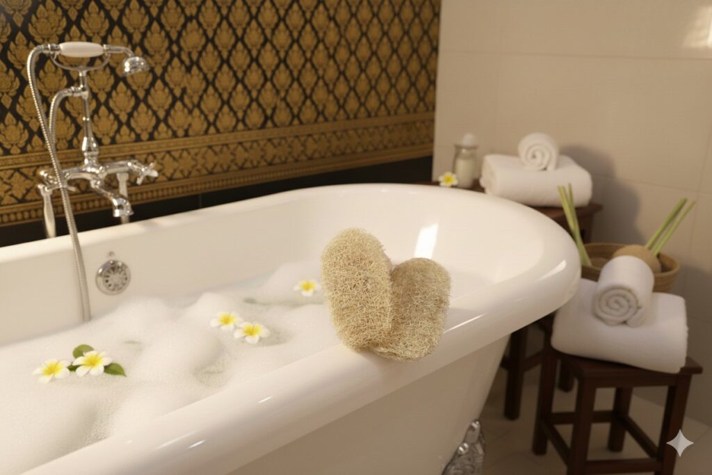 อุปกรณ์ขัดผิวจากใยบวบธรรมชาติ ใช้สำหรับขัดทำความสะอาดผิวกาย ช่วยขจัดเซลล์ผิวที่ตายแล้ว และทำให้ผิวรู้สึกสะอาดเรียบเนียน